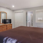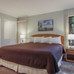 2 Bedroom Deluxe Unit with 1100 sq. foot of living space. Sleeping arrangements – 1 king bed in master bedroom, 1 queen bed in guest bedroom, and double sofa sleeper in living room. Master bath with shower, Jacuzzi tub, and hairdryer, guest bath with tub/shower combo. Full kitchen, gas fireplace in living room, washer/dryer, dining area for six, private deck. Cable television, wireless internet and DVD player.