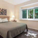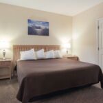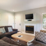 2 Bedroom Deluxe Unit with 1100 sq. foot of living space. Sleeping arrangements – 1 king bed in master bedroom, 1 queen bed in guest bedroom, and double sofa sleeper in living room. Master bath with shower, Jacuzzi tub, and hairdryer, guest bath with tub/shower combo. Full kitchen, gas fireplace in living room, washer/dryer, dining area for six, private deck. Cable television, , and DVD player. Sunporch.