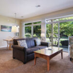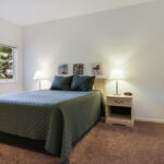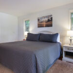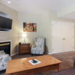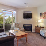 2 Bedroom Deluxe Unit with 1100 sq. foot of living space. Sleeping arrangements – 1 king bed in master bedroom, 1 queen bed in guest bedroom, and double sofa sleeper in living room. Master bath with shower, Jacuzzi tub, and hairdryer, guest bath with tub/shower combo. Full kitchen, gas fireplace in living room, washer/dryer, dining area for six, private deck. Cable television, wireless internet. DVD player in master bedroom.